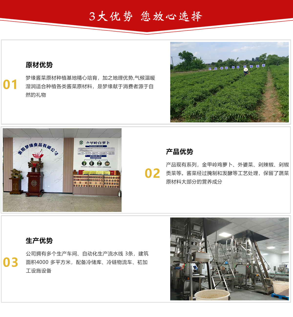 公司自有及通過訂單直接聯系基地面積超過 1000 畝,其中包括金甲嶺蘿卜基地、辣椒、黃瓜等蔬菜基地,間接聯系定向訂單收購蔬菜基地面積超過 2000 畝。公司擁有多個生產車間、自動化生產流水線 3條,建筑面積 4000 多平方米,配備冷儲庫、冷鏈物流車、初加工設施設備。公司嚴格按照食品的相關標準要求進行廠房、生產布局建設。公司通過訂單合同、定向采購等合作方式從當地農戶、合作社等直接采購各類蔬菜原材料進行生產加工,主營產品包括金甲嶺雞蘿卜、外婆菜、剁辣椒、剁椒貢菜等,年加工產值達 7000 萬元,年納稅一百多萬。